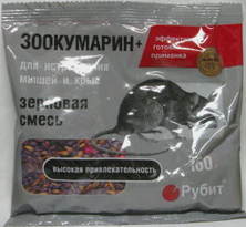 Родентицид от грызунов "ЗООКУМАРИН+ЗЕРНО" разработан для эффективной борьбы с крысами, мышами и всевозможными видами грызунов, в разных типах помещений, а также на сельскохозяйственных полях, на свалках, в жилых домах, на водоемах, канализационных коллекторах. Препарат готов к применению и нет необходимости в добавлении других кормов. При проникновении в организм грызуна этот препарат воздействует на синтез протромбина, что ведет к нарушению механизма кровесвертывания и провоцирует склонность к кровотечениям. Препарат очень хорошо привлекает грызунов и употребляется ими в пищу. Грызуны погибают на 4-5 день после употребления "ЗООКУМАРИН+ЗЕРНО", поэтому препарат не вызывает страх к приманке.