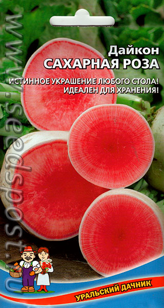 Раннеспелый суперурожайный сорт. Плоды выровненные, круглые, белого цвета, диаметром 10 см. Мякоть плотная, хрустящая, сладко-острая, малиново-розовая, очень сочная и вкусная. Вкусовые качества отличные, с нотками легкого орехового привкуса, мякоть без горечи, характерной для редьки.