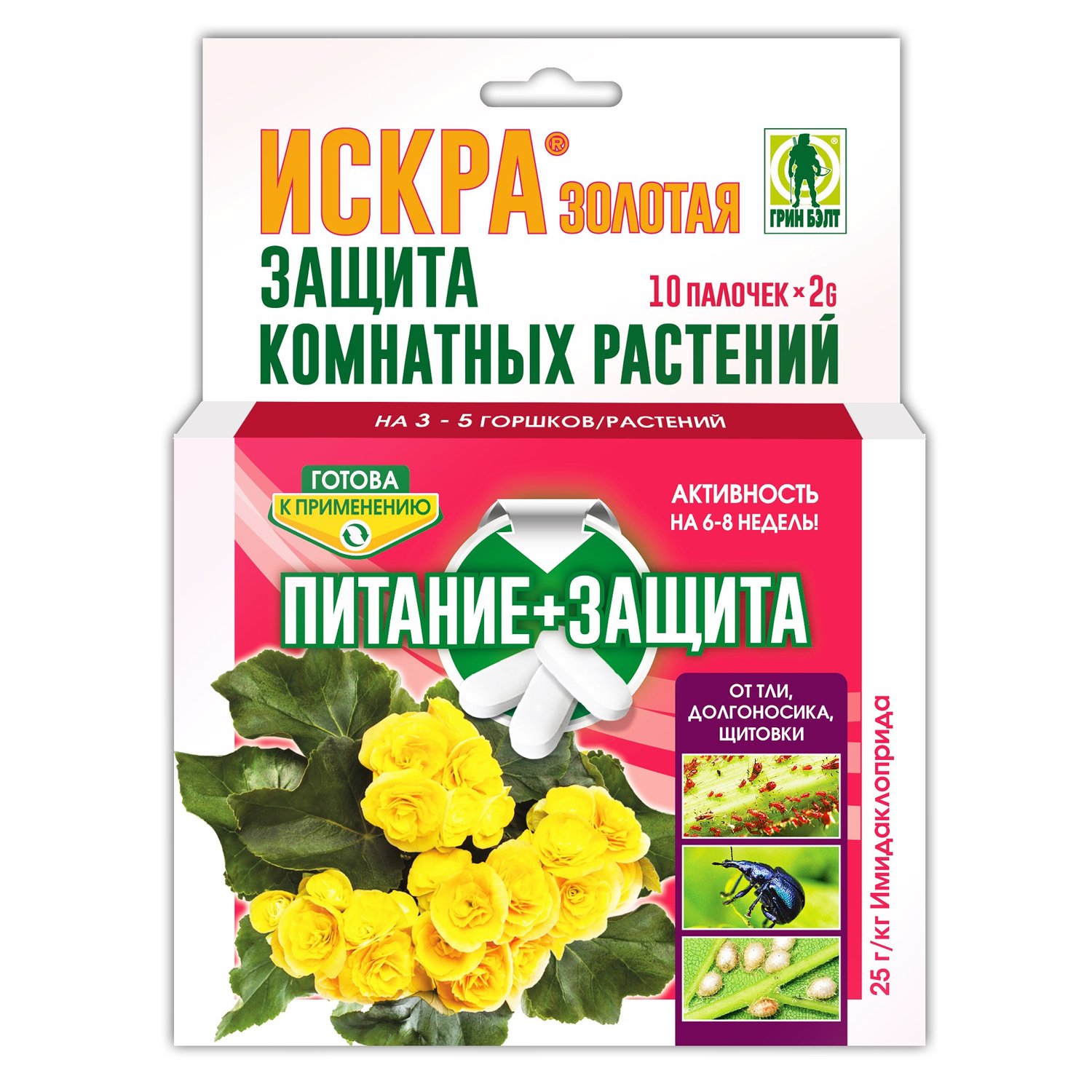 Палочки для внесения в почву для защиты комнатных растений от тли, щитовок, долгоносиков и других вредителей. Содержат активный компонент имидаклоприд. Они растворяются в почве при регулярном поливе и активное вещество всасывается корнями растения. С клеточным соком инсектицид поступает в листья и уничтожает вредителей. Защитное действие продолжается до 2-х месяцев. Кроме эффективной защиты палочки содержат подкормку основными элементами питания растений – азотом, калием, фосфором.